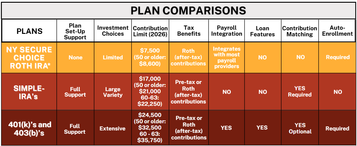 After much anticipation, the the New York Secure Choice Savings Program is now in effect. Employers in New York State that fall under a certain criteria and do not offer a retirement plan will be required to have an employer-sponsored plan implemented by the below deadlines based on company size: